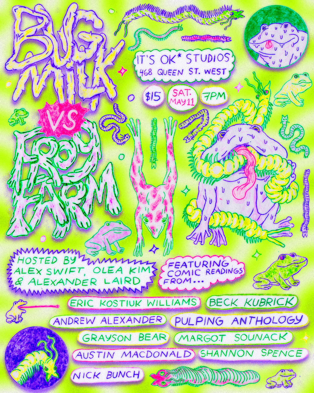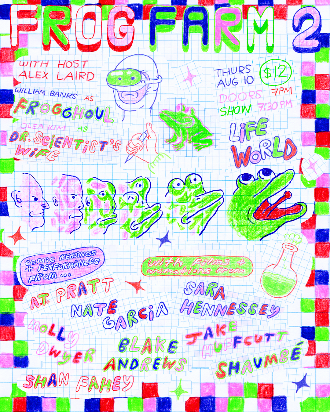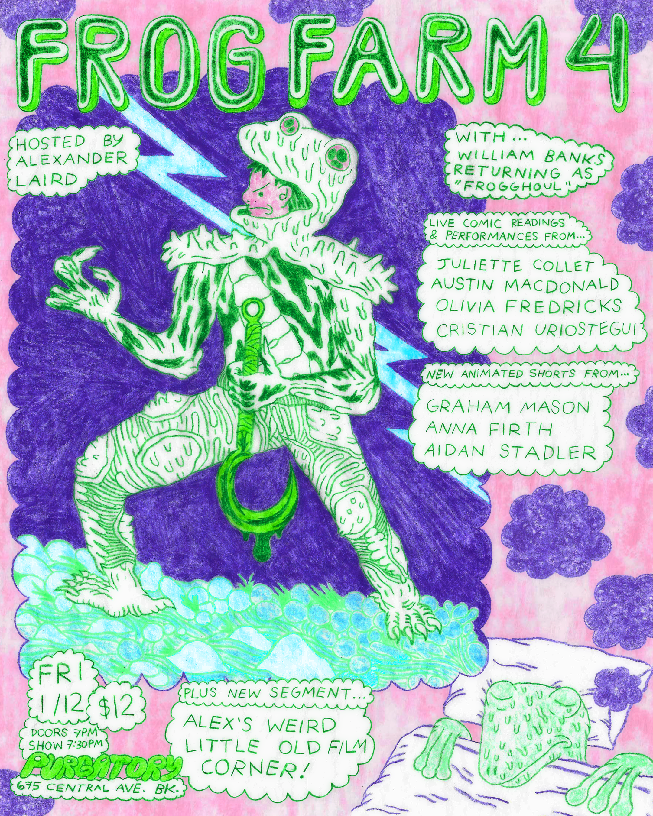 Frog Farm is a comics and animation collective that publishes hand-made comics and puts on regular live events with comic readings, animations and wacky recurring characters.
